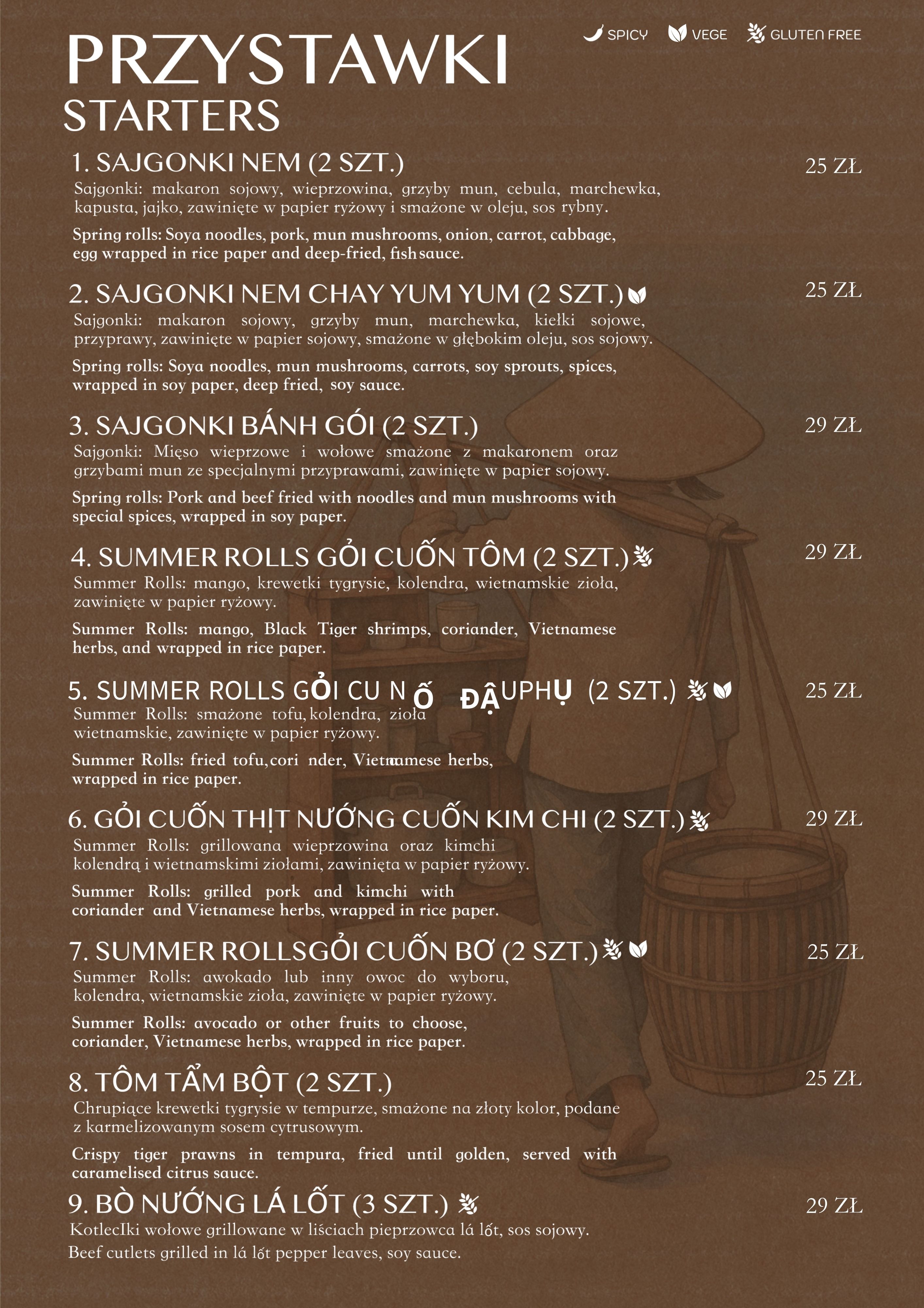 wieprzowina, szalotka, makaron ryżowy, sajgonki i świeże warzywa