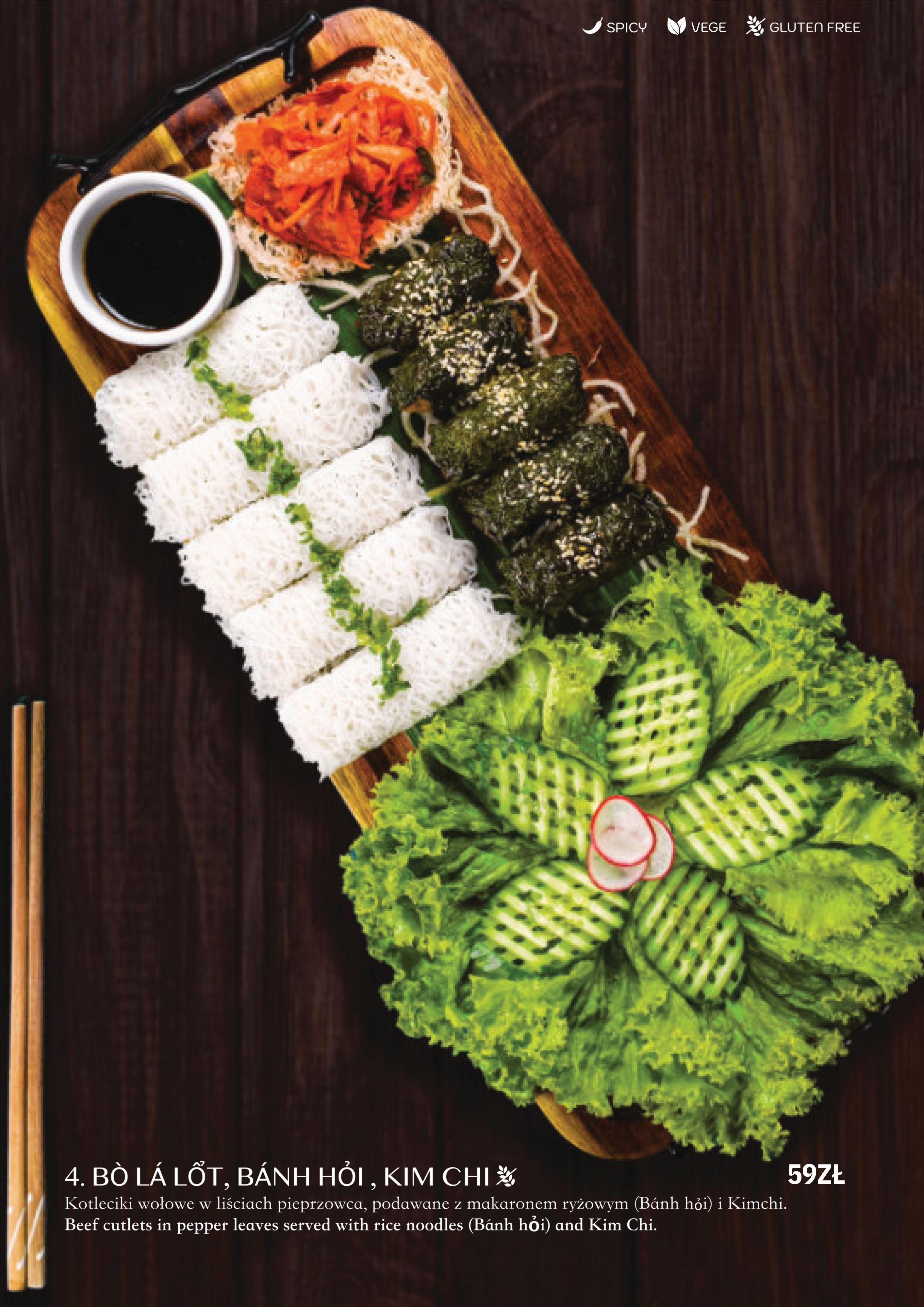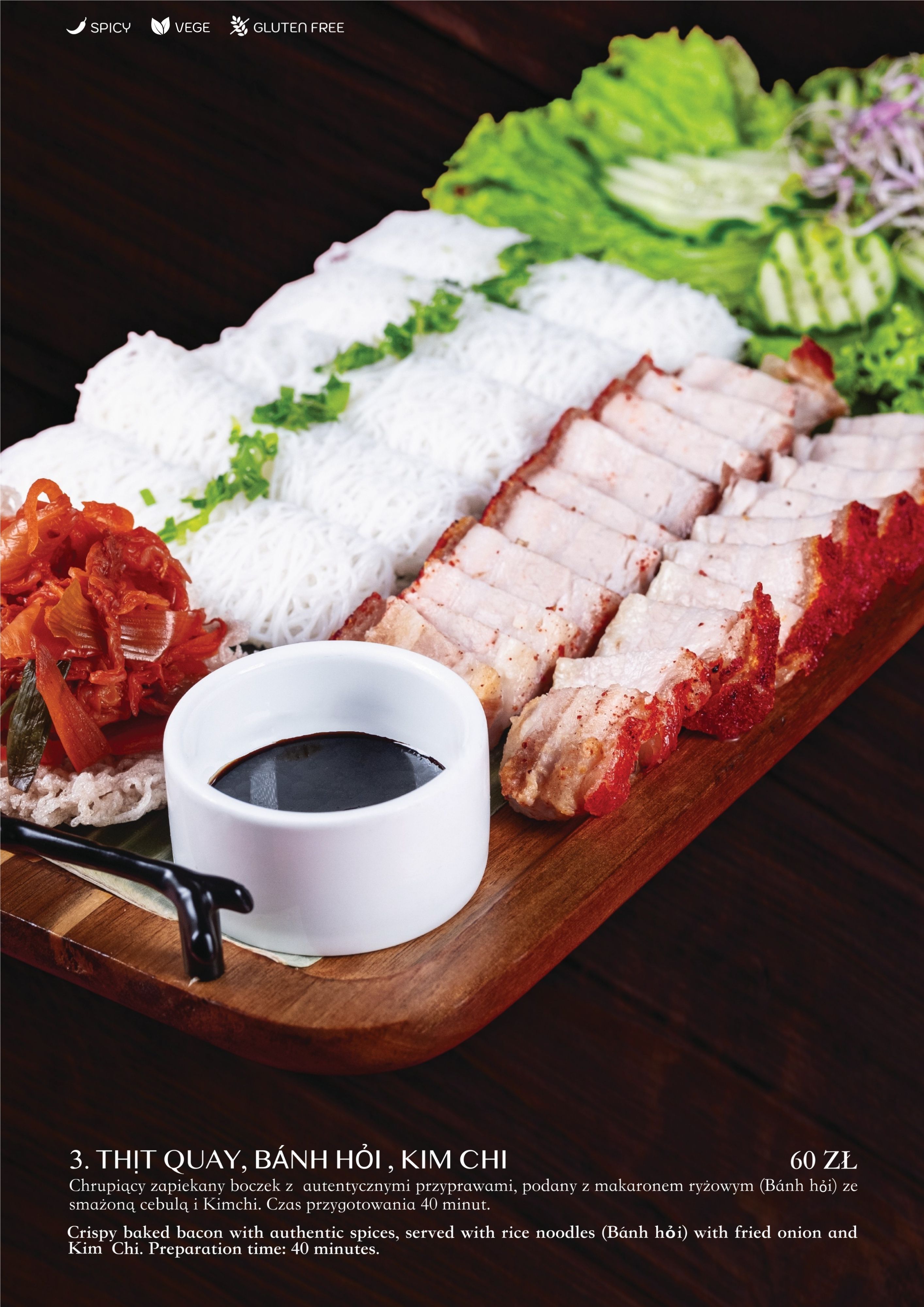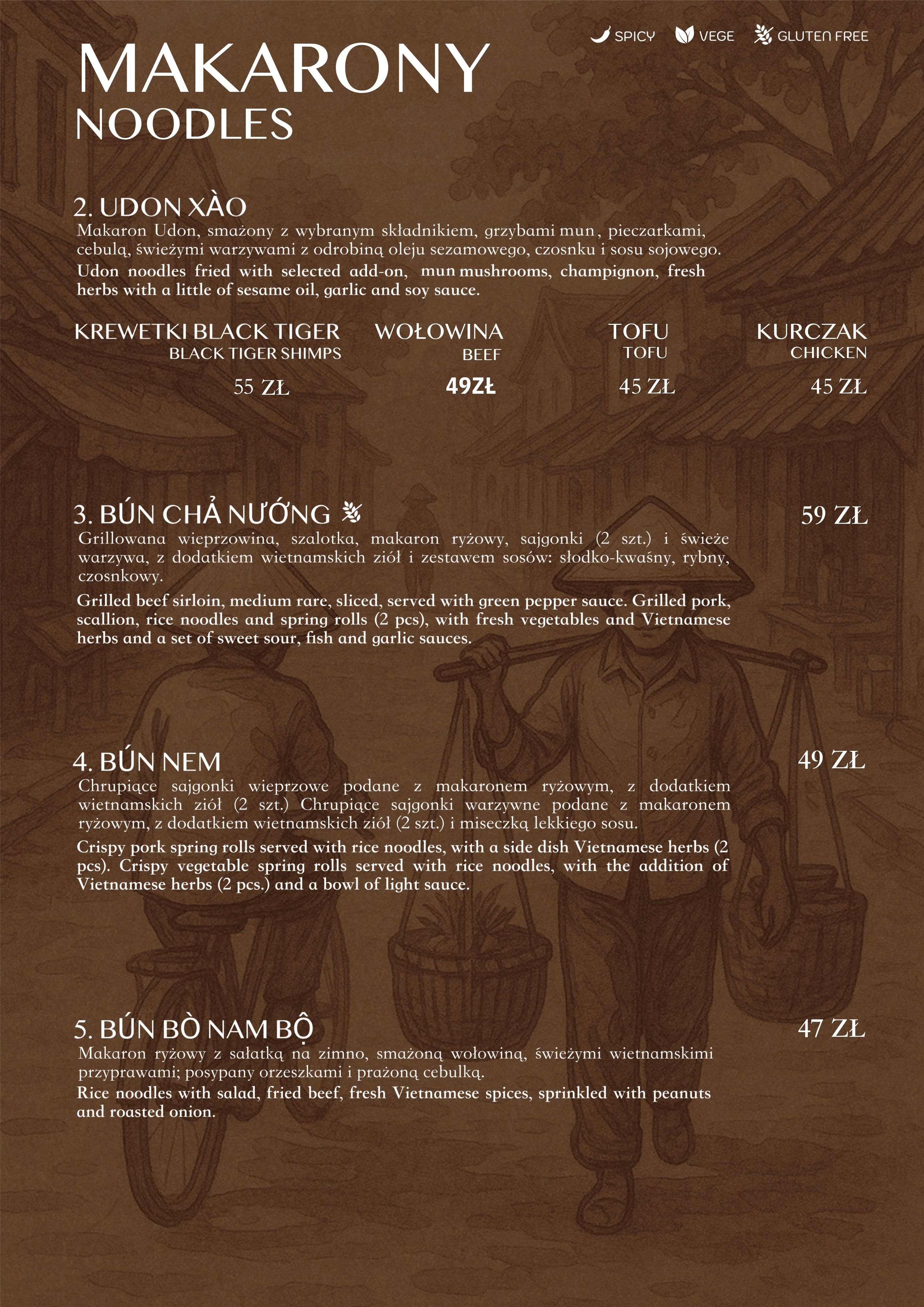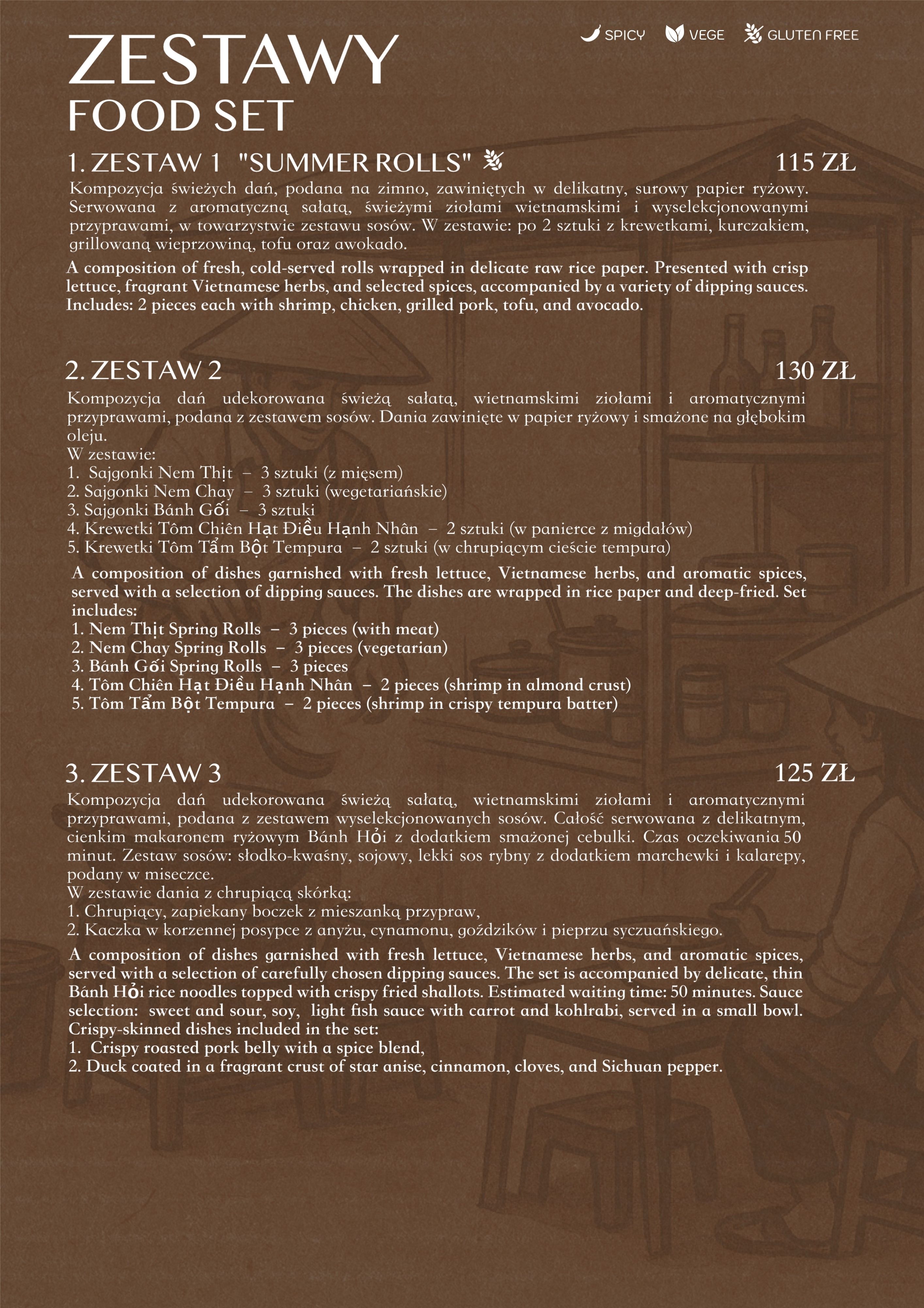 wieprzowina, szalotka, makaron ryżowy, sajgonki i świeże warzywa
